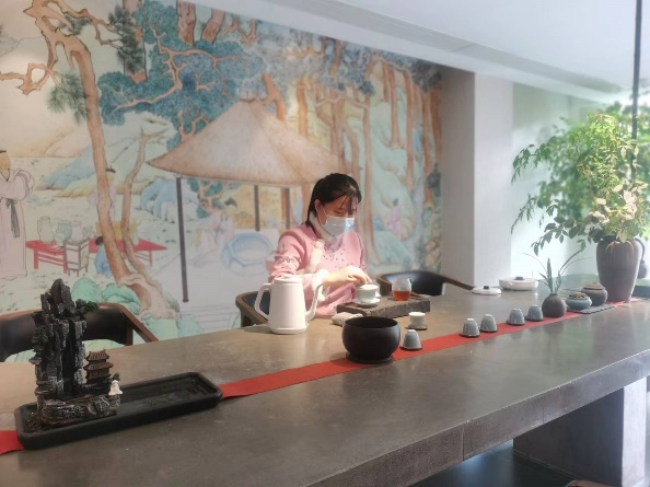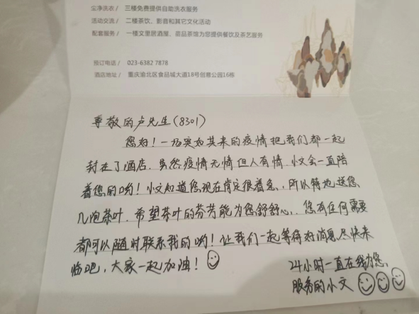 酒店值班经理付琪琪每天早上都会在大厅茶台沏茶。因为防疫要求不能聚集,她就将沏好的茶给每一间房间的客人送去。“疫情期间我们泡的茶叶都是酒店出品的茶,品控很有保障,我和当班的妹妹还会一起手写慰问卡片,随同泡好的茶一并送到房间,让他们在房间就能喝到我们茶艺术酒店的好茶”,付琪琪说。