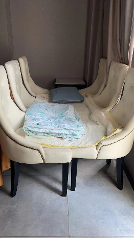 由于无法进入酒店,再加上凌晨就要开始准备早饭、确保餐食供应,徐彩玲便带领大家住在餐厅里椅子拼成的“床”上。虽然条件艰苦,但她心里暖暖的:“特殊时期能让大家吃得好吃得开心,就是我们最大的快乐了。”